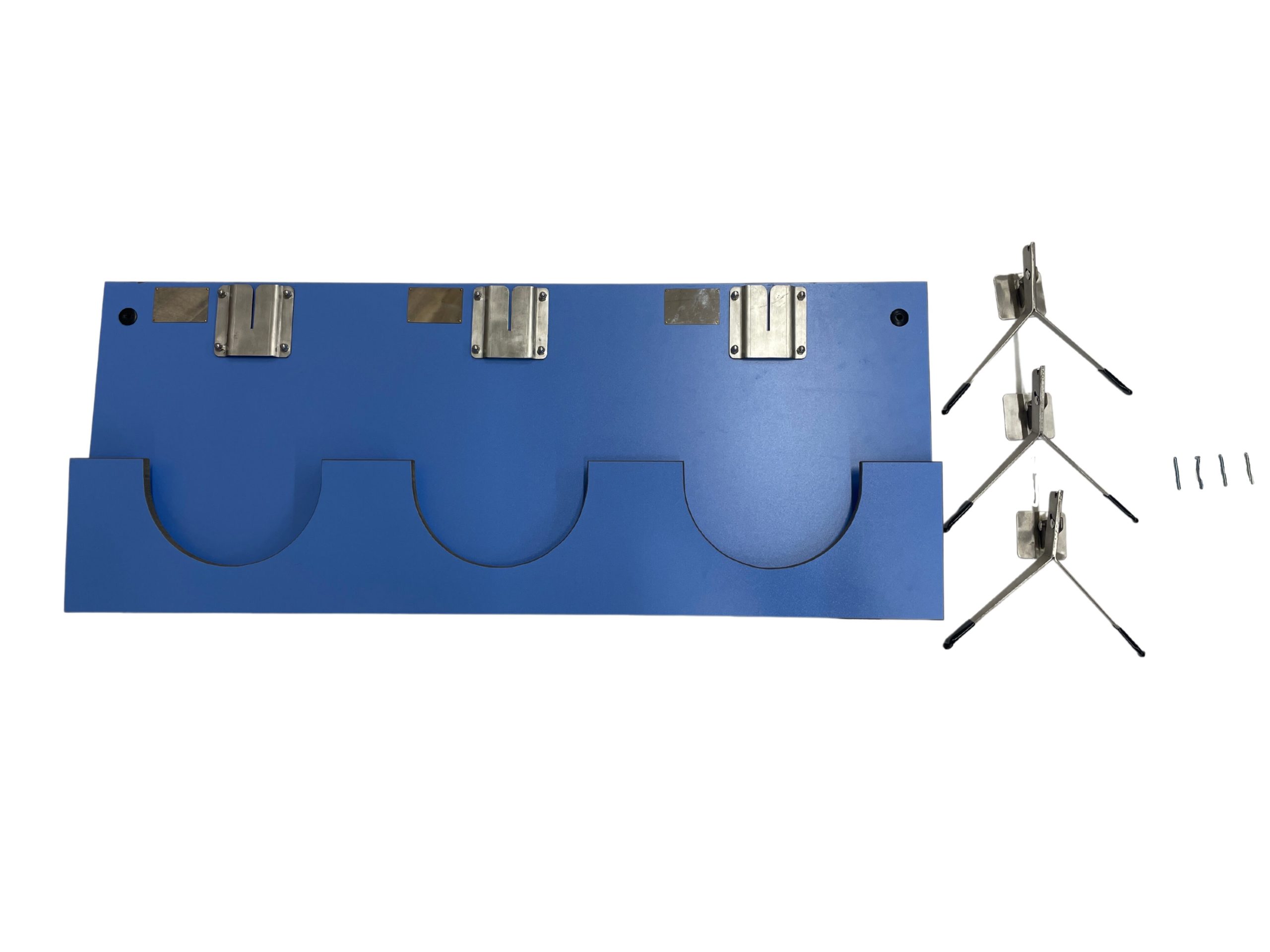 この商品1つで、最大3名分のハーネスとヘルメットを収納することができます。実際に3名分のヘルメット+ハーネスをかけてみるとこのような感じになります。