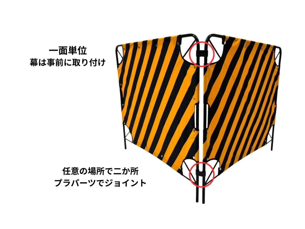 | 備考 | ご利用条件に合わせて2面式、3面式、4面式をお選びいただけます。全て1面幕付きタイプでのご提供となります。取り付け方法はジョイント部品をご用意しております。 1面サイズ H900㎜×W1000㎜。約2.5㎏ |